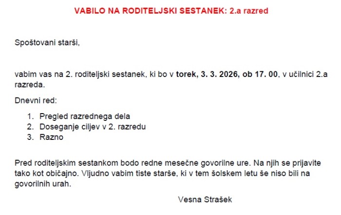 VABILO NA RODITELJSKI SESTANEK ZA 2.A RAZRED