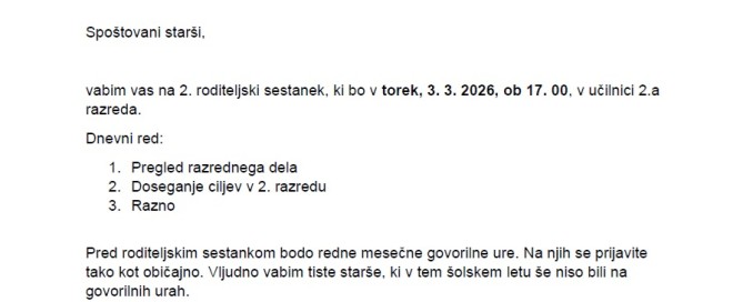 VABILO NA RODITELJSKI SESTANEK ZA 2.A RAZRED